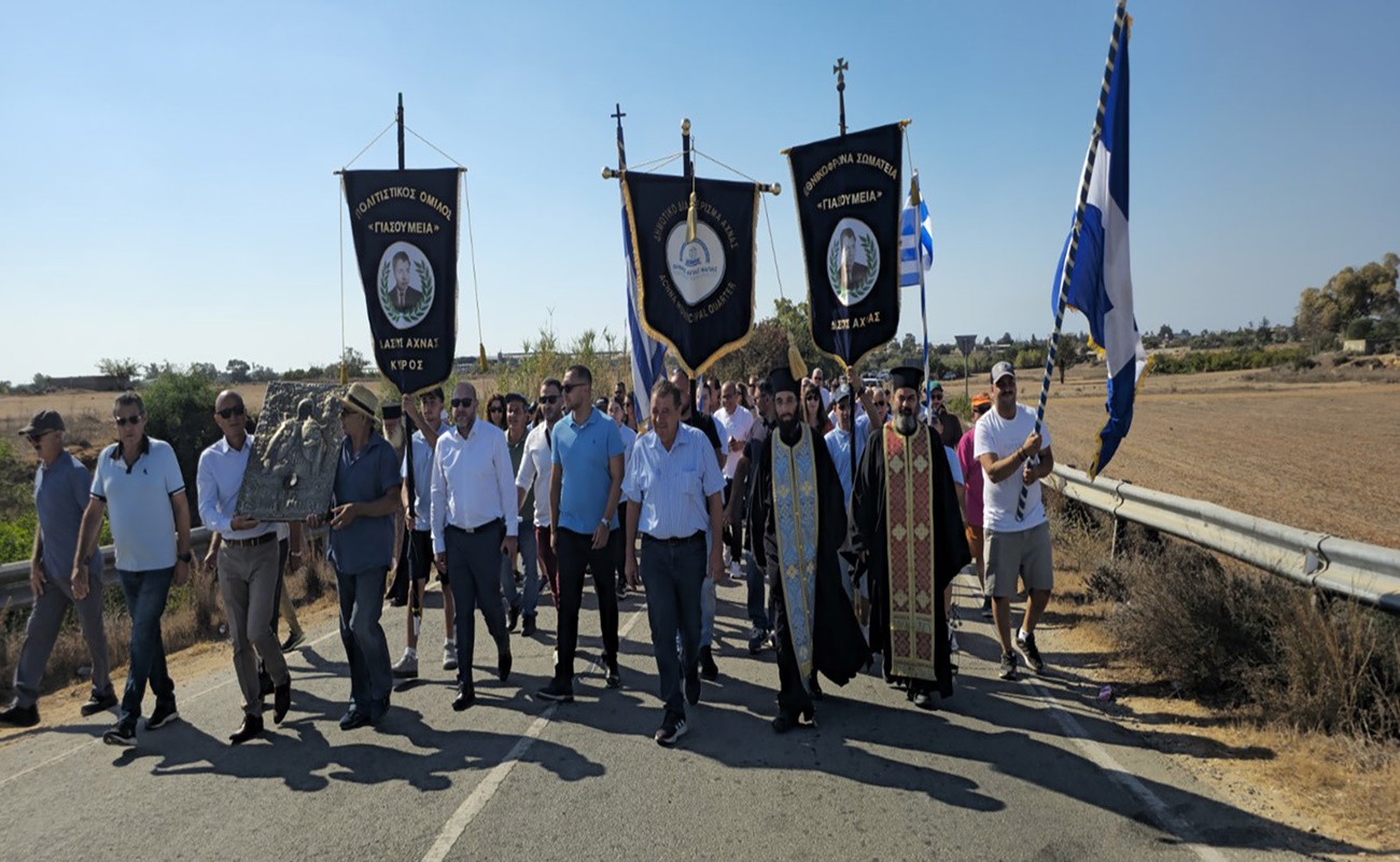 Σε χαιρετισμό του ο αντιδήμαρχος Άχνας Νίκος Βασίλης ανέφερε ότι «είναι η 9η φορά που συγκεντρωνόμαστε σήμερα με την εικόνα της Αγίας Μαρίνας που μεταφέρθηκε από την κατεχόμενη εκκλησία της Άχνας, για να διαδηλώσουμε και να καταλάβουν οι Τούρκοι πως δεν θα ξεχάσουμε τα σπίτια και τις περιουσίες μας. Είναι δικά μας και θα τα διεκδικούμε όσα χρόνια και αν περάσουν μέχρι να επιστρέψουμε πίσω στα χώματα μας».