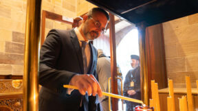 «Ο κ. Σκέμπερης καταρχάς ξεναγήθηκε στον ιστορικό Ιερό Καθεδρικό Ναό του Ευαγγελισμού της Θεοτόκου, όπου ιδιαιτέρως εντυπωσιάστηκε από τις αγιογραφικές συνθέσεις οι οποίες τον κοσμούν ύστερα από την πρόσφατη ανακαίνισή του».