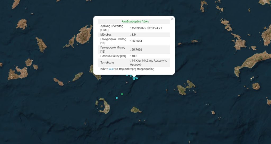 Σύμφωνα με το Γεωδυναμικό Ινστιτούτο, το επίκεντρο του σεισμού εντοπίζεται στα 14χλμ. νότια-νοτιοδυτικά της Αρκεσίνης Αμοργού.