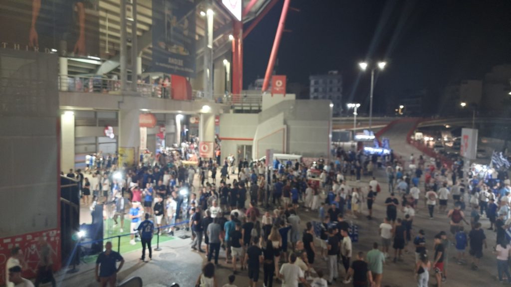 Στο γήπεδο ένας πρωτοφανής χαμός με πάνω από 35.000 κόσμο καθώς δεν έπεφτε καρφίτσα, τρομερός παλμός και χαμός στην ανάκρουση του Εθνικού μας ύμνου.