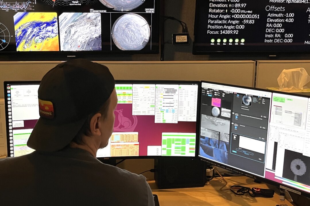 “On a good night, we’ll observe 40 to 50 objects—and that’s a fairly productive night,” telescope operator Mike Calkins said as he monitored three computer screens filled with target data.