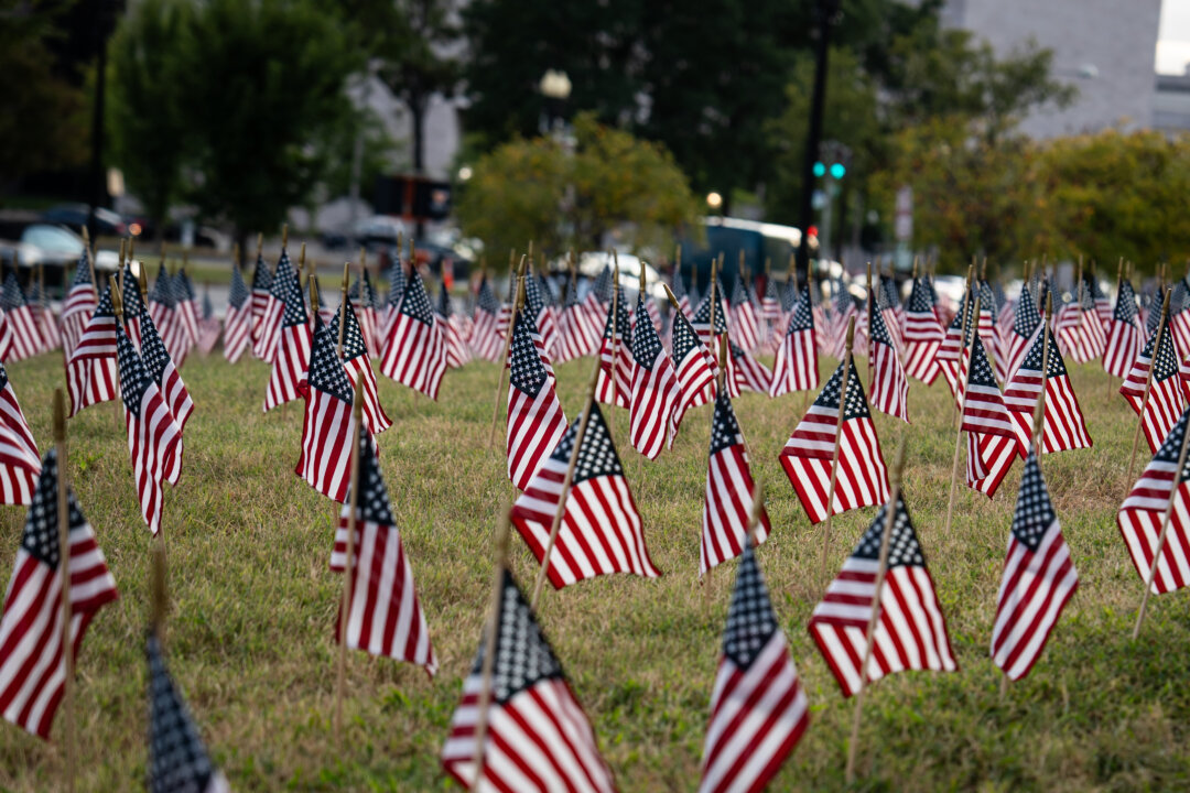 A U.S. flag is unfurled off the Pentagon at 6:30 a.m. ET on Sept. 11 to mark the 24th anniversary of the Sept. 11, 2001, terrorist attacks.