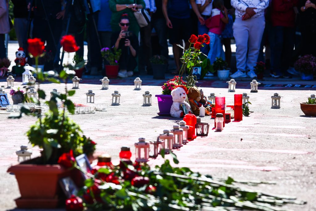 Η μαθητική παρέλαση μόλις ολοκληρώθηκε και οι παρευρισκόμενοι στέκονταν μπροστά στα 57 ονόματα που είχαν σημειωθεί με κόκκινη μπογιά. Η πρόεδρος της Πλεύσης Ελευθερίας, Ζωή Κωνσταντοπούλου, μοίρασε κόκκινα τριαντάφυλλα στους παρευρισκόμενους. Μαζί της ήταν και η κόρη του αντιστασιακού Λάκη Σάντα, Αλεξάνδρα, αγκαλιασμένη με τον Ηλία Παπαγγελή, πατέρα της Αναστασίας που σκοτώθηκε στα Τέμπη.