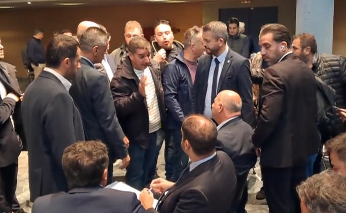 Αγρότες της περιοχής έσπασαν το αστυνομικό μπλόκο και, έφτασαν με τα τρακτέρ έξω από το κτήριο, ενώ στη συνέχεια μπήκαν στην αίθουσα, περικυκλώνοντας τον Υπουργό Αγροτικής Ανάπτυξης και Τροφίμων, Κώστα Τσιάρα.