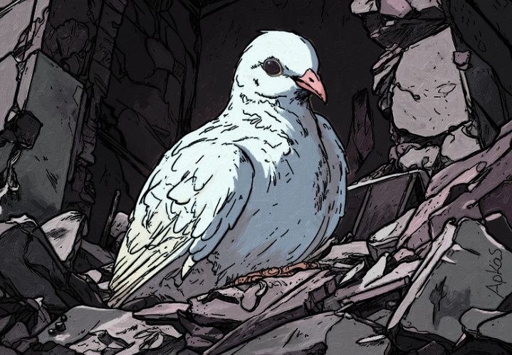 Ένα λευκό περιστέρι, σύμβολο ειρήνης και ζωής, κάθεται πάνω στα ερείπια. Το φως πέφτει απαλά πάνω του, ενώ γύρω επικρατεί σκοτάδι και σιωπή. Δεν χρειάζονται λόγια· η εικόνα μιλάει από μόνη της.