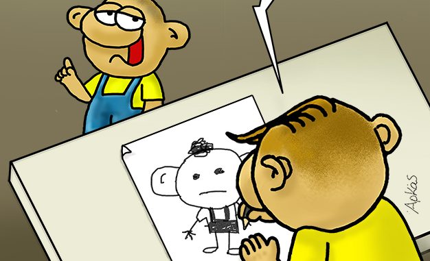 Αυτή τη φορά, ο Θανασάκης κοιτάει τον φίλο του, επίσης ψευδό, που προσπαθεί μάταια να ζωγραφίσει τα… τεράστια αυτιά του.
