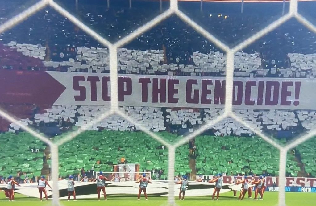 Πιο συγκεκριμένα ανέβασαν ένα τεράστιο κορεό που απεικόνιζε την παλαιστινιακή σημαία, με το μήνυμα «σταματήστε την γενοκτονία». Παράλληλα, υπήρχε και ένα δεύτερο πανό, το οποίο έγραφε: «Λευτεριά στην Παλαιστίνη».