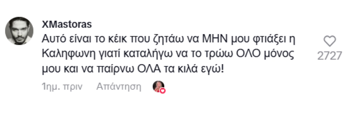 Ανάμεσα στα σχόλια που δέχτηκε κάτω από το βίντεο της, ήταν και εκείνο του συντρόφου της, με εκείνον να σχολιάζει με χιούμορ: «Αυτό είναι το κέικ που ζητάω να μην μου φτιάξει η Καληφώνη γιατί καταλήγω να το τρώω όλο μόνος μου και να παίρνω όλα τα κιλά εγώ».