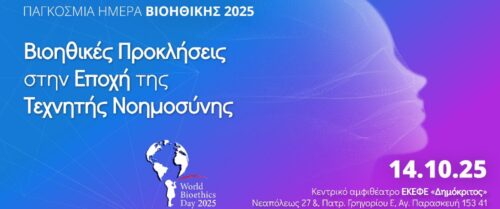 Η Παγκόσμια Ημέρα Βιοηθικής 2025 πραγματοποιήθηκε στις 14 Οκτωβρίου 2025 στο κατάμεστο Κεντρικό Αμφιθέατρο του Εθνικού Κέντρου Έρευνας Φυσικών Επιστημών «Δημόκριτος» με θέμα «Βιοηθικές Προκλήσεις στην Εποχή της Τεχνητής Νοημοσύνης». Η εκδήλωση διοργανώθηκε από το Ελληνικό Κλιμάκιο της International Chair in Bioethics (WMA Cooperation Center) με την υποστήριξη του Εργαστηρίου Εφαρμοσμένης Φιλοσοφίας του Τμήματος Φιλοσοφίας του ΕΚΠΑ σε συνεργασία με το Εθνικό Κέντρο Έρευνας Φυσικών Επιστημών «Δημόκριτος», την Εθνική Αρχή Βιοηθικής και Τεχνοηθικής, το Ευρωπαϊκό Εργαστήριο Βιοηθικής, Τεχνοηθικής και Δικαίου του Παντείου Πανεπιστημίου, το Κέντρο Βιοιατρικής Ηθικής και Δεοντολογίας και το Ερευνητικό Κέντρο Βιοπολιτικής του Παντείου Πανεπιστημίου Αθηνών.