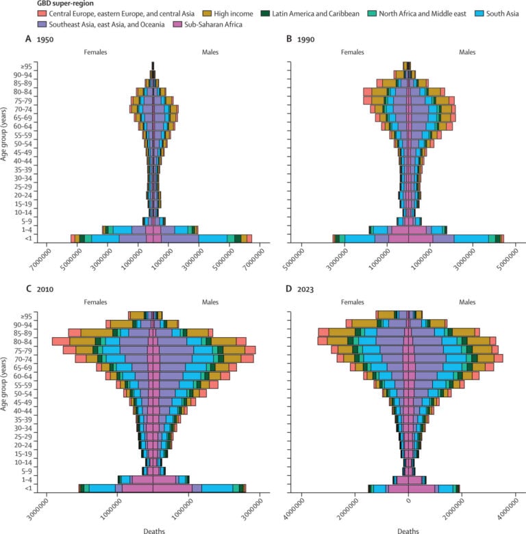 Αντίθετα, ο αριθμός των θανάτων βρεφών και μικρών παιδιών κάτω των πέντε ετών μειώθηκε περισσότερο από οποιαδήποτε άλλη ηλικιακή ομάδα. Από το 2011 ως το 2023, η ανατολική Ασία κατέγραψε τη μεγαλύτερη μείωση (68%) στο ποσοστό θνησιμότητας λόγω διατροφής, εμβολίων και ισχυρότερων συστημάτων υγείας.