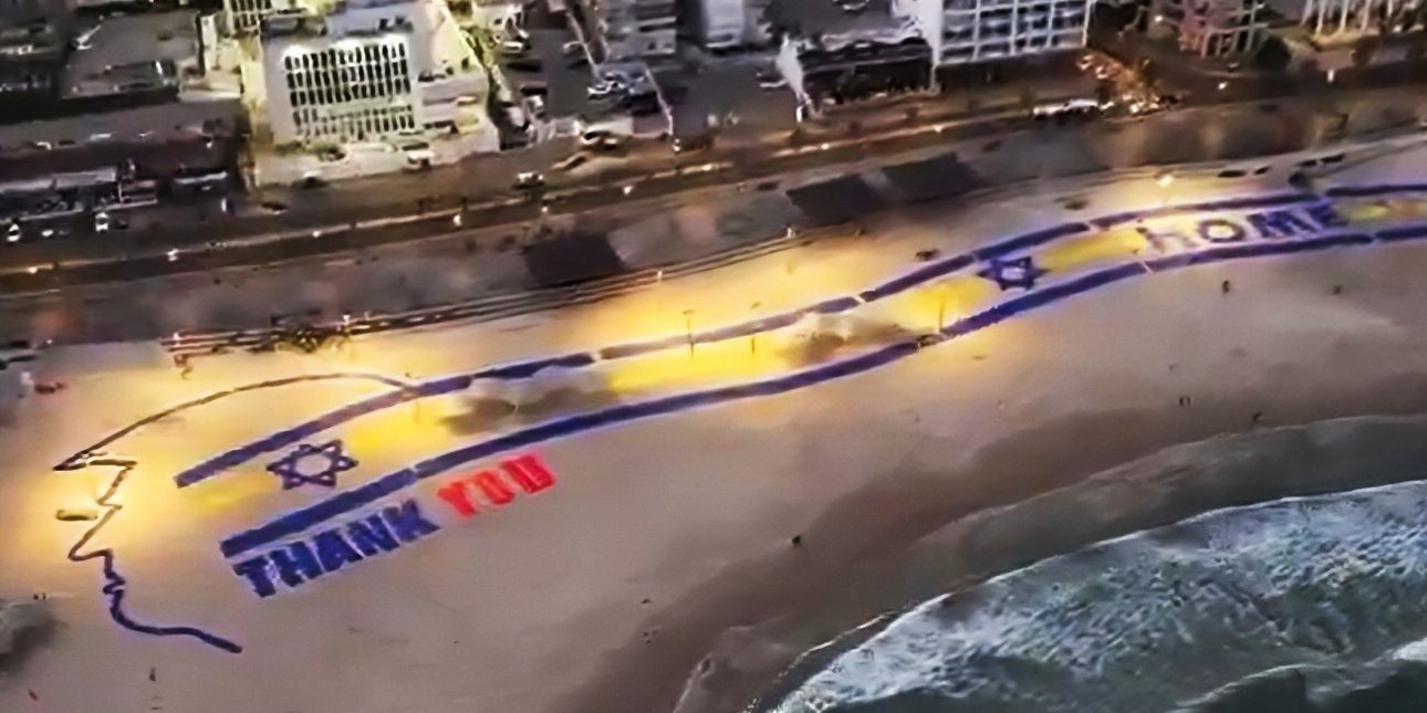 When President Trump lands in Israel in a few hours, he’ll be greeted with this sight – a giant banner along the Tel Aviv beach thanking him for bringing the hostages home and ending the war