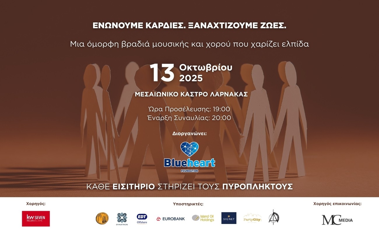 Αντίστροφη μέτρηση για τη μεγάλη βραδιά του Blue Heart Foundation που διοργανώνεται στο Μεσαιωνικό Κάστρο της Λάρνακας και είναι αφιερωμένη στους πυρόπληκτους, που μέσα στο καλοκαίρι που πέρασε δοκιμάστηκαν σκληρά από τις φλόγες.