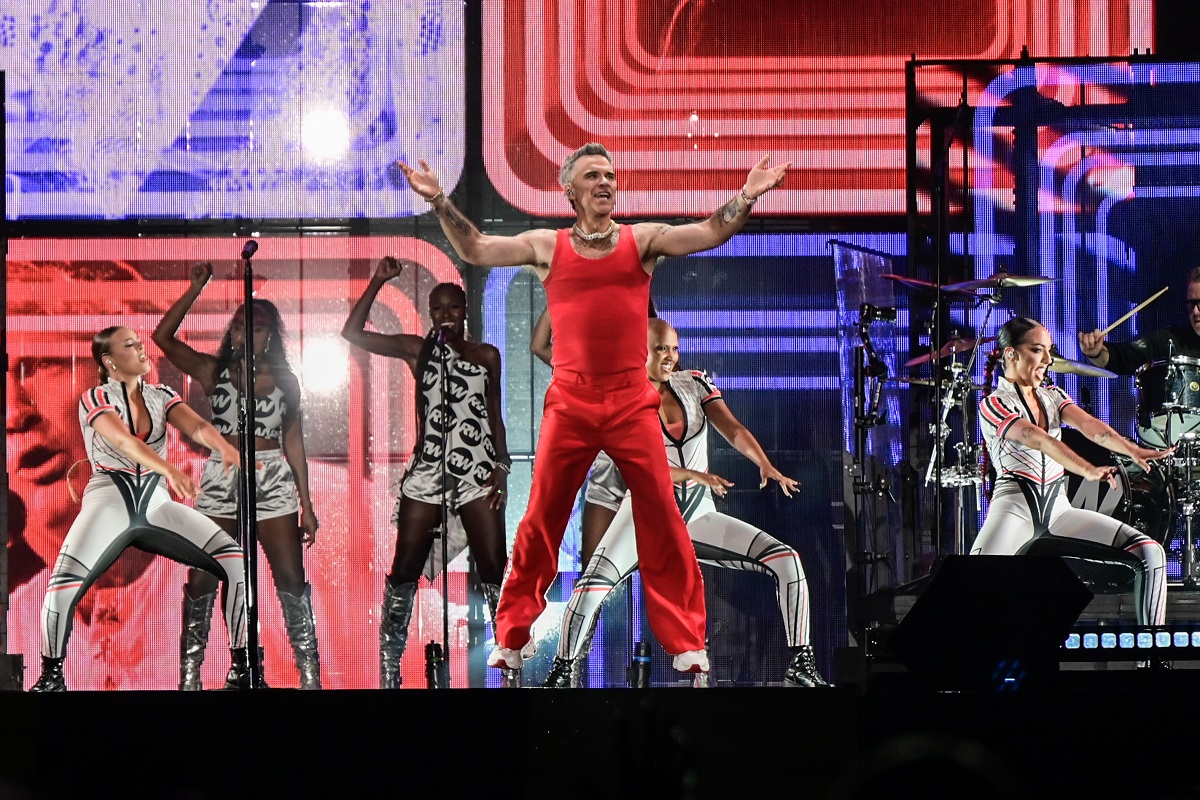 Φορώντας κόκκινα ρούχα, ο Ρόμπι Γουίλιαμς εμφανίστηκε μπροστά στο κοινό και έκανε την ατμόσφαιρα να πάρει «φωτιά», ερμηνεύοντας τις μεγάλες επιτυχίες του.