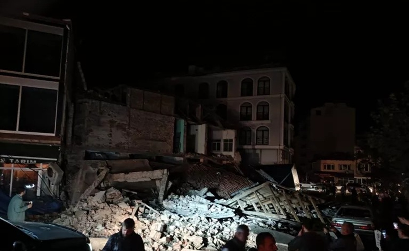 Balıkesir Sındırgı’da meydana gelen 6,1 büyüklüğündeki deprem sonrası bir bina yıkıldı