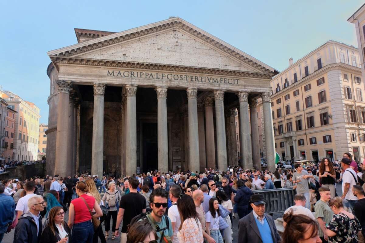 Η περιοχή γύρω από τον εξωτερικό τοίχο του Πάνθεον είναι ιδιαίτερα πολυσύχναστη από τουρίστες που σταματούν για να ξεκουραστούν ή να τραβήξουν φωτογραφίες. Το Πάνθεον, που κατασκευάστηκε από τον Ρωμαίο αυτοκράτορα Αδριανό και είναι γνωστό για τον επιβλητικό θόλο του με το χαρακτηριστικό άνοιγμα, παραμένει ένα από τα πιο επισκέψιμα μνημεία της Ιταλίας.