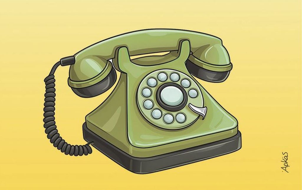 Ο γνωστός δημιουργός επιλέγει να ζωγραφίσει ένα κλασικό σταθερό τηλέφωνο – εκείνο το παλιό μοντέλο που μας θυμίζει τις εποχές πριν από την εμφάνιση των κινητών.