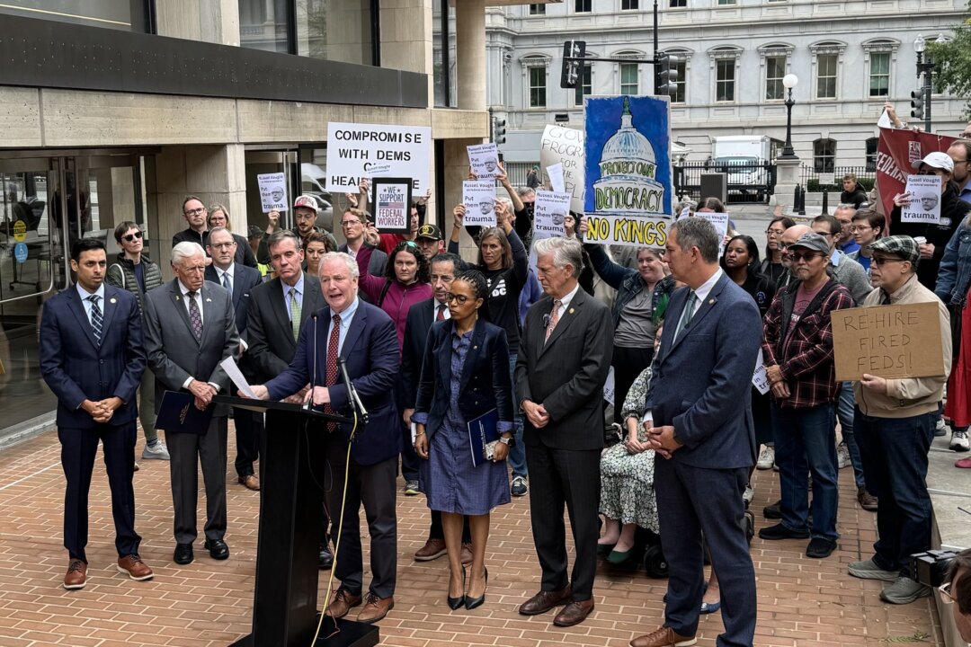 WASHINGTON—Democratic lawmakers, at a press conference outside the Office of Management and Budget (OMB) on Oct. 14, demanded that federal workers receive back pay when the ongoing government shutdown ends.