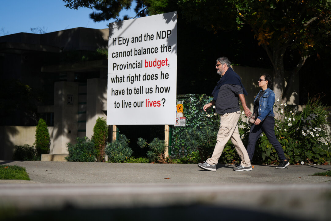 The signs were critical of the provincial NDP and David Eby, with one reading, “Eby will tell you the Conservatives are ‘Far Right’ but neglects saying that the NDP is ‘Communist.’”