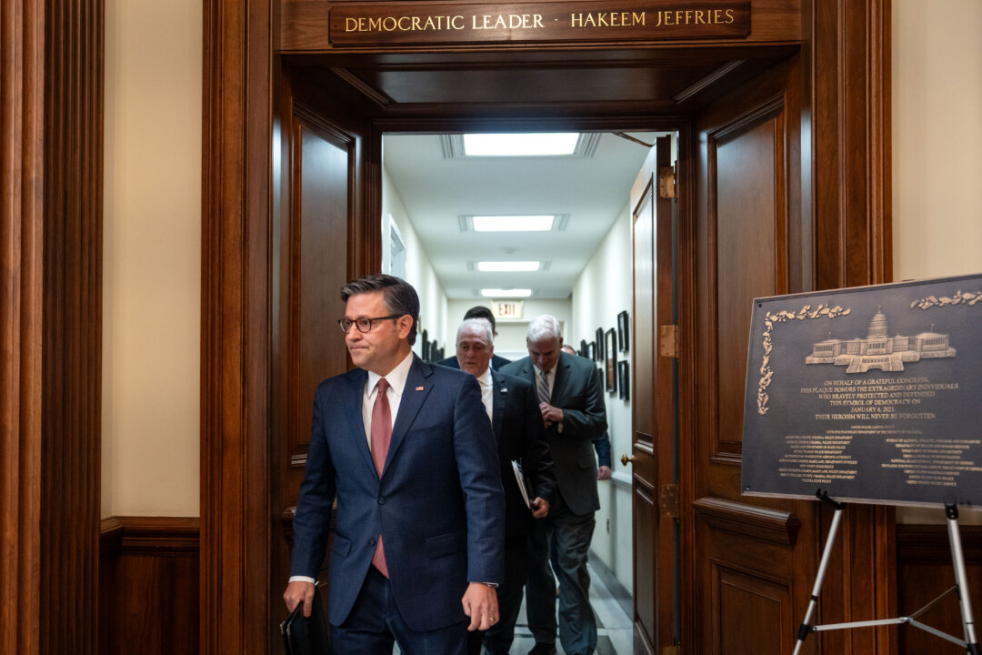 House Speaker Mike Johnson (R-La.), Majority Leader Steve Scalise (R-La.), Whip Tom Emmer (R-Minn.), Conference Chair Lisa McClain (R-Mich.), Republican Study Committee Chairman August Pfluger (R-Texas), and Republican Study Committee members hold a press conference at 10 a.m. ET on Oct. 28, marking the 28th day of the government shutdown.