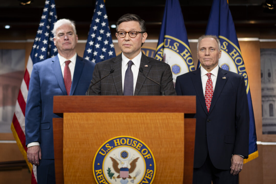 House Speaker Mike Johnson (R-La.), Majority Leader Steve Scalise (R-La.), Whip Tom Emmer (R-Minn.), Conference Chairwoman Lisa McClain (R-Mich.), and House Oversight Committee Chairman James Comer (R-Ky.) hold a press conference at 10 a.m. ET on Oct. 21 to address the ongoing government shutdown.