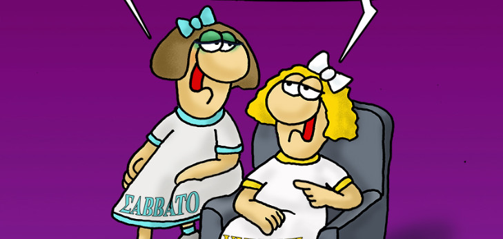 Στο σημερινό σκίτσο του Αρκά, φαίνονται δύο φίλες που προσωποποιούν τις ημέρες του Σαββατοκύριακου. Το Σάββατο και η Κυριακή, καθισμένες δίπλα-δίπλα και συζητούν.