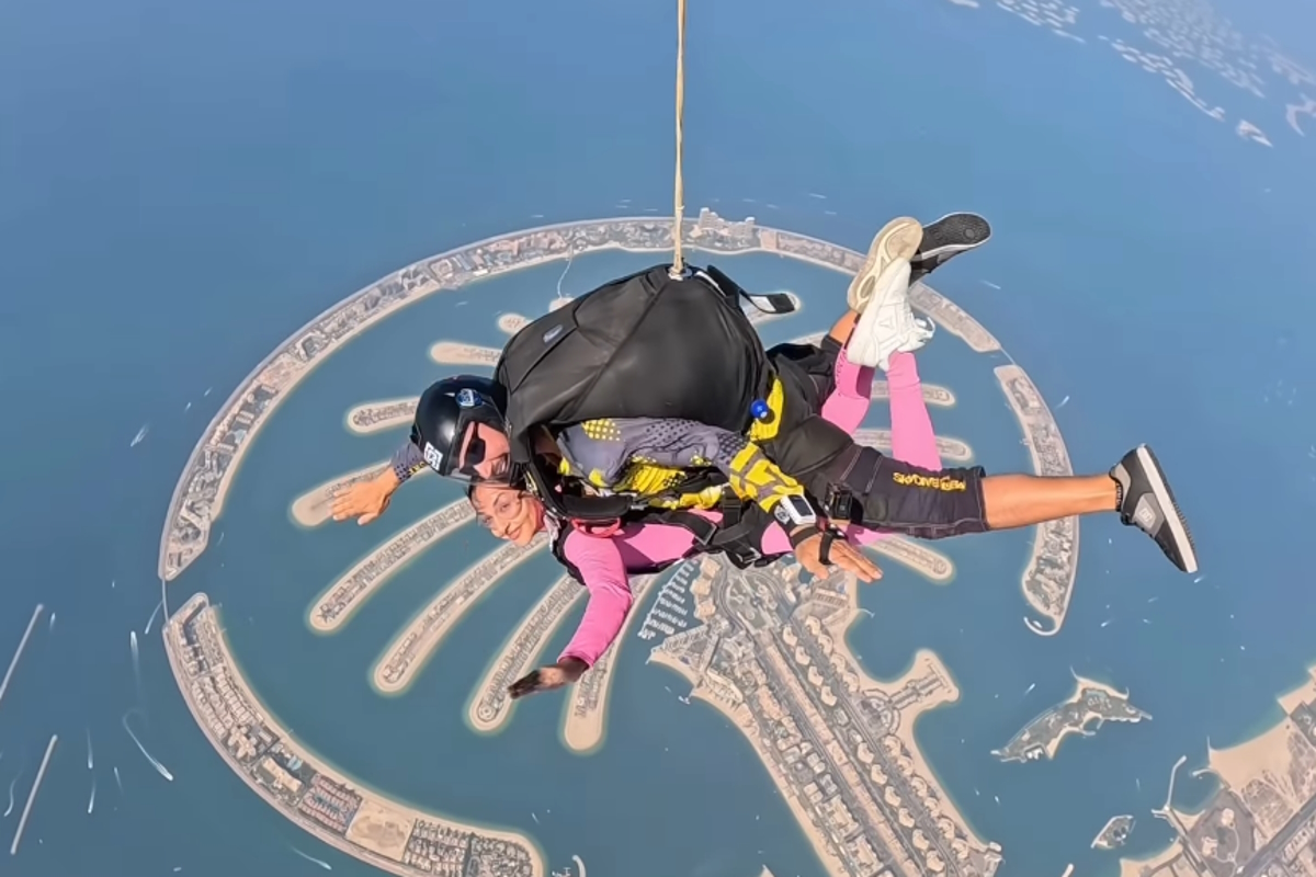 Στο βίντεο φαίνεται να προετοιμάζεται φορώντας τον απαραίτητο εξοπλισμό και στη συνέχεια κάνει το μεγάλο άλμα στο κενό μαζί με τον εκπαιδευτή της.