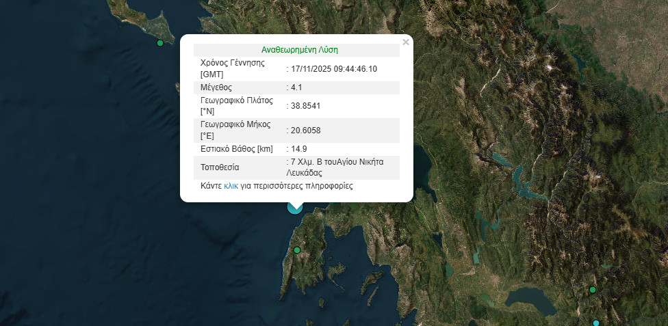Σεισμική δόνηση μεγέθους 4,1 Ρίχτερ σημειώθηκε το πρωί της Δευτέρας στη Λευκάδα. Σύμφωνα με τα πρώτα στοιχεία, ο σεισμός καταγράφηκε στις 11:44 ώρα Ελλάδας, με εστιακό βάθος 14,9 χιλιομέτρων και επίκεντρο 7 χιλιόμετρα βόρεια του Αγίου Νικήτα.