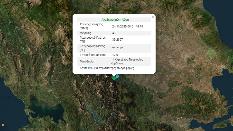 Σεισμική δόνηση μεγέθους 4,2 Ρίχτερ σημειώθηκε στις 10:51 το πρωί της Δευτέρας 24 Νοεμβρίου 2025 στην Καρδίτσα.