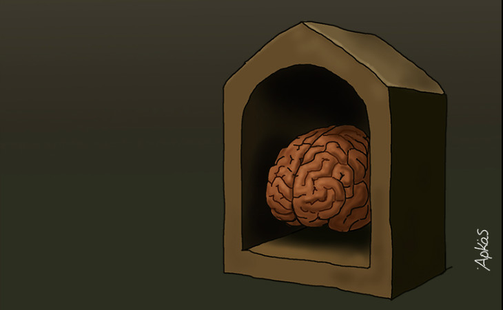 Στην εικόνα, ένας εγκέφαλος προστατευμένος μέσα σε ένα «καταφύγιο», συνοδεύεται από τη φράση: «Η βεβαιότητα είναι το ασφαλές καταφύγιο των ηλιθίων. Τους προστατεύει από τη δοκιμασία της σκέψης και την αγωνία της αμφιβολίας.»