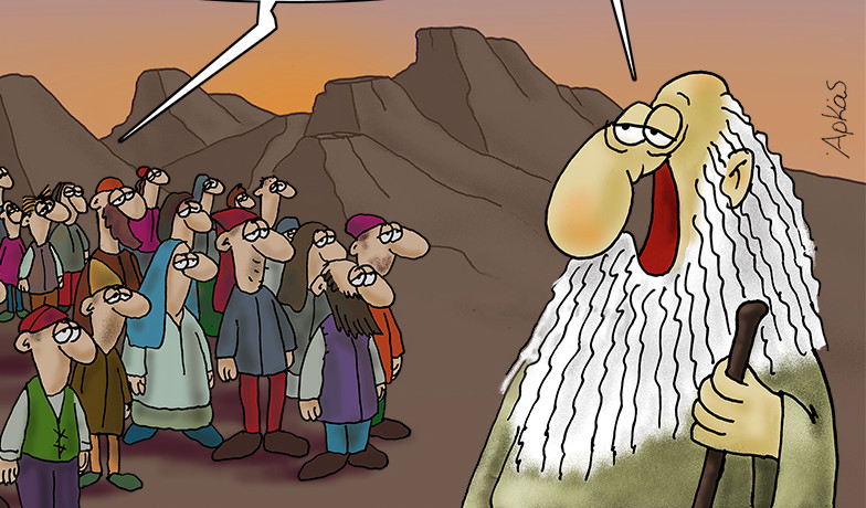 Στο σκίτσο, ένας «σοφός» – πιθανότατα αναφορά στον Μωυσή – κοιτάζει το πλήθος και λέει: «Αν η μόρφωση ήταν βροχή, εδώ θα ήταν Σαχάρα!»