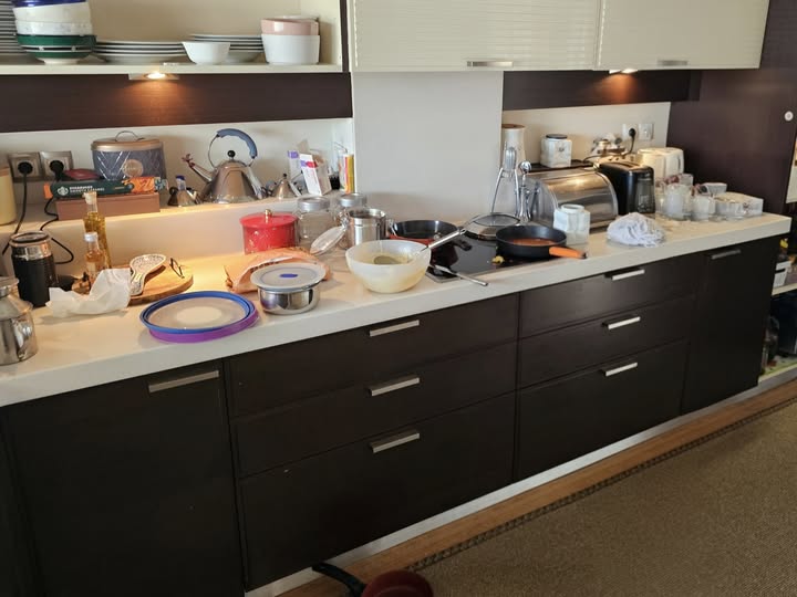 Δεν χρειάστηκε να μαγειρέψω γιατί τα ταπεράκια στο ψυγείο έκαναν δουλίτσα, όμως η επιρροή του Master Chef στην Ελληνική οικογένεια ήταν σαφής, όταν χθες το πρωί αντίκρισα αυτή την εικόνα στην κουζίνα (ναι υπάρχει τηγάνι στο πάτωμα!).