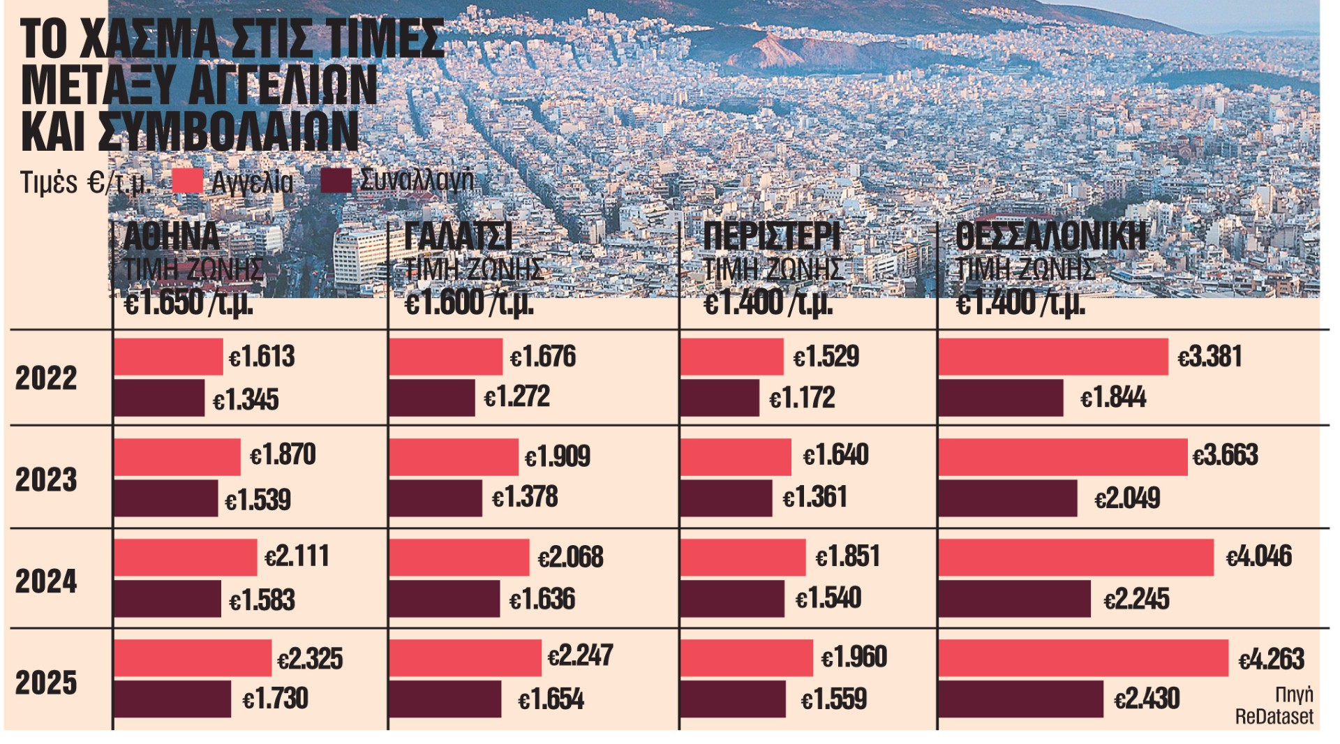 Τα πρόσφατα στοιχεία της ReDataset, τα οποία συγκρίνουν ζητούμενες τιμές και πραγματικές αγοραπωλησίες σε βασικές αστικές περιοχές της χώρας για την περίοδο 2022-2025, δείχνουν ότι το χάσμα μεταξύ των τιμών σε αγγελίες και σε συναλλαγές σχεδόν διπλασιάστηκε μέσα σε τέσσερα χρόνια. Από 19,9% το 2022 έφτασε στο 34,4% το 2025. Σε απόλυτους όρους, οι αγγελίες κινούνται στα 2.325 ευρώ ανά τετραγωνικό, ενώ οι πραγματικές τιμές πώλησης περιορίζονται στα 1.730 ευρώ το τετραγωνικό.