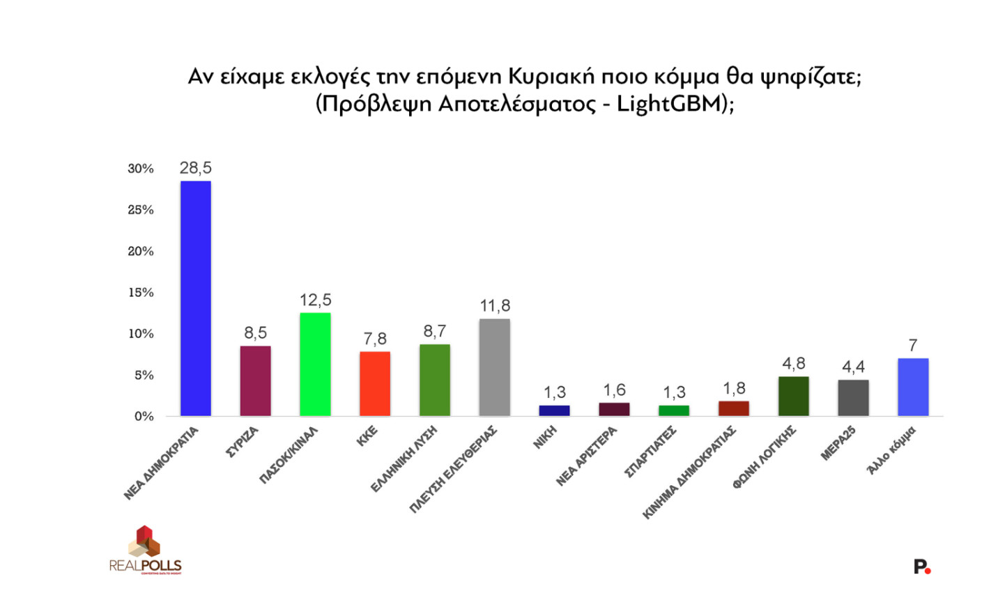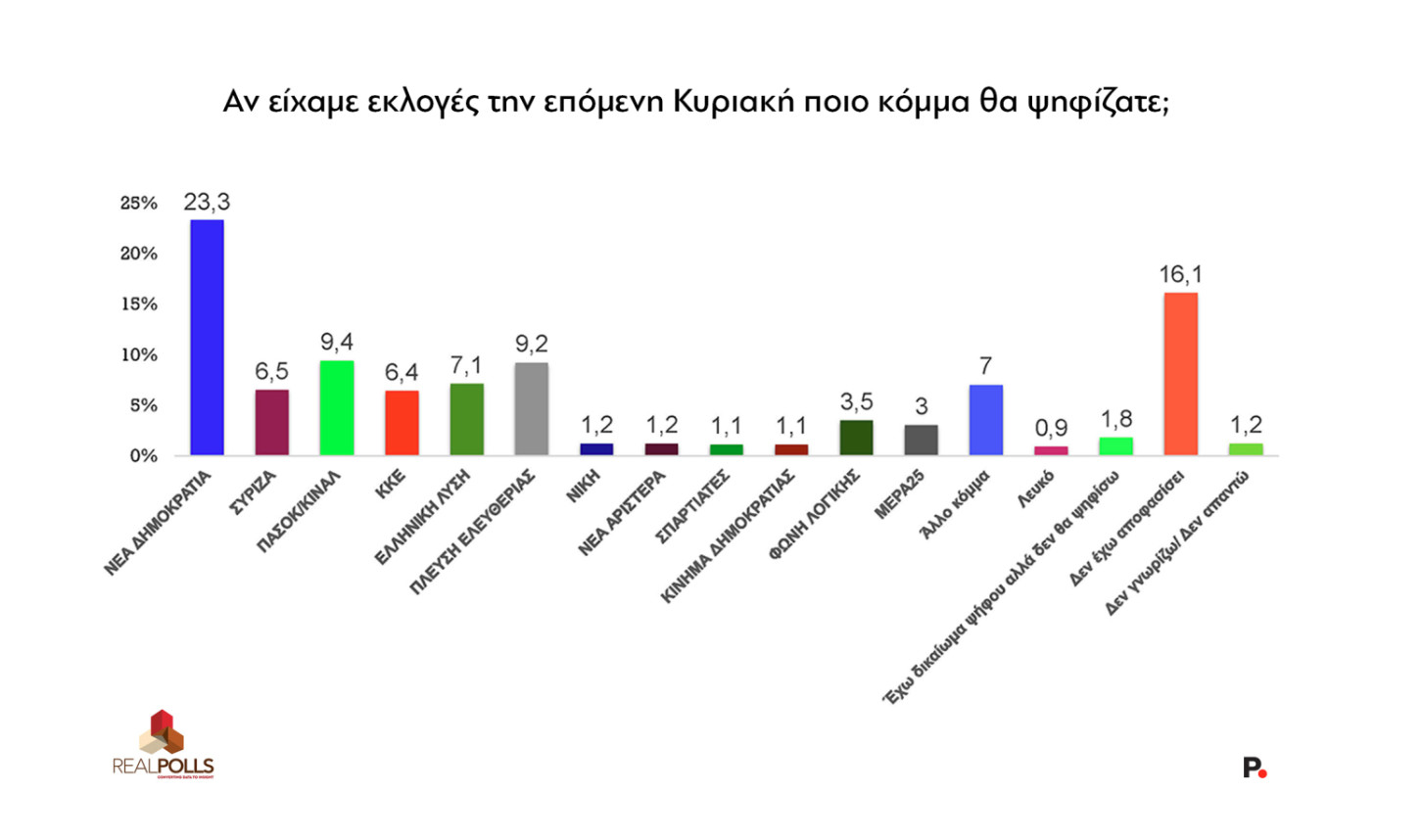 Η δημοσκόπηση της Real Polls για το protagon.gr δείχνει ότι η Νέα Δημοκρατία διατηρεί προβάδισμα περισσότερο από το διπλάσιο σε σχέση με το ΠΑΣΟΚ.