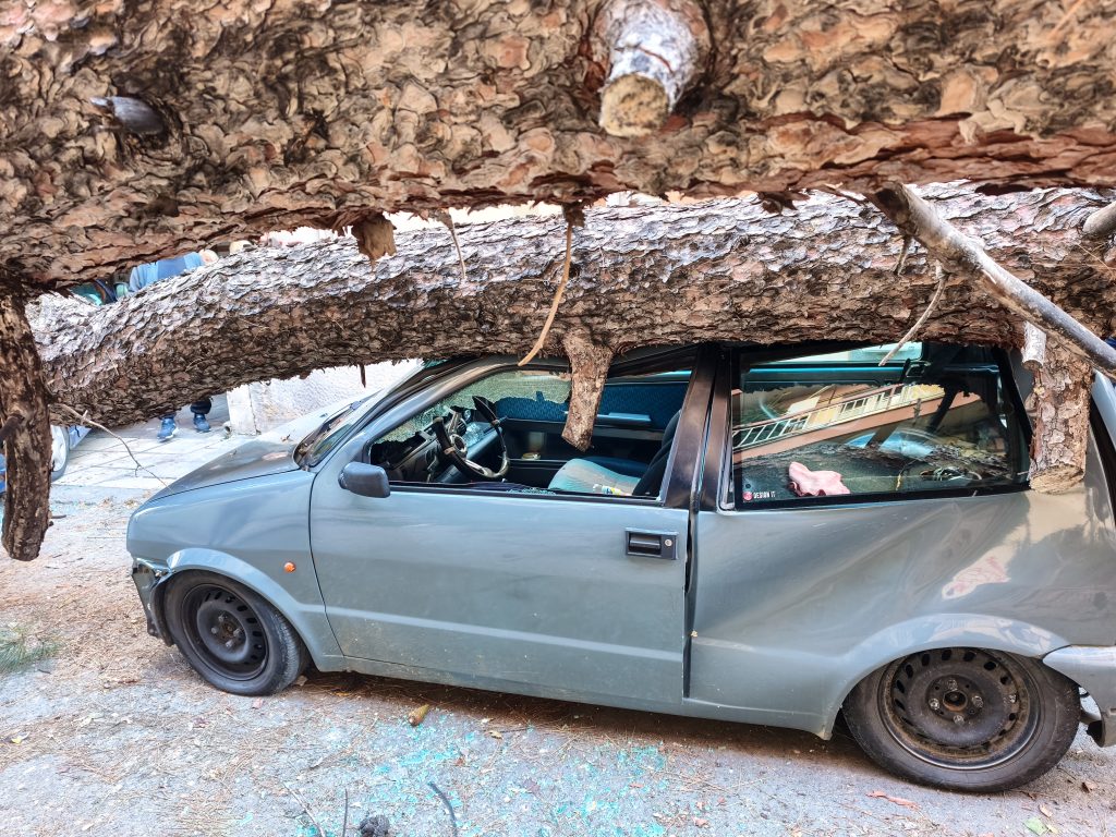 Στη Χαριλάου Θεσσαλονίκης, ένα μεγάλο πεύκο έπεσε και καταπλάκωσε δύο σταθμευμένα αυτοκίνητα.