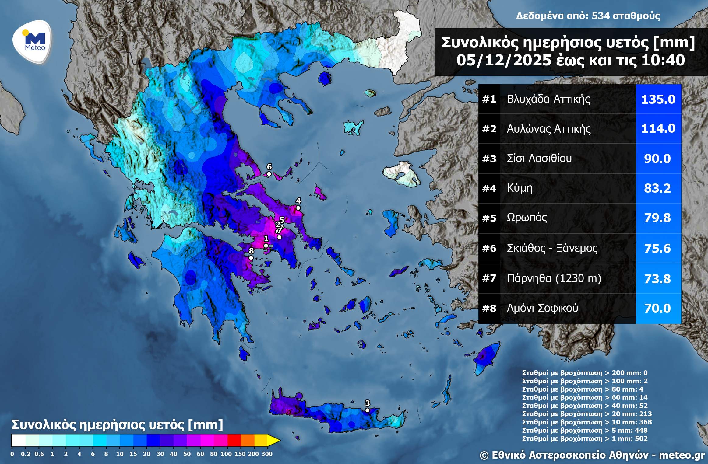 Πολύ μεγάλα ύψη βροχής καταγράφηκαν από τις πρώτες πρωινές ώρες της Παρασκευής 05/12 στην Αττική, την Κρήτη, την Εύβοια και τις Σποράδες. Σύμφωνα με το δίκτυο αυτόματων μετεωρολογικών σταθμών του Εθνικού Αστεροσκοπείου Αθηνών / Meteo.gr τα μεγαλύτερα ύψη βροχής μέχρι τις 10:40 καταγράφηκαν στην Βλυχάδα Αττικής με 135mm, ακολουθεί ο Αυλώνας Αττικής με 114mm και το Σίθι Λασιθίου με 90mm όπως αποτυπώνεται στο Χάρτη 1.