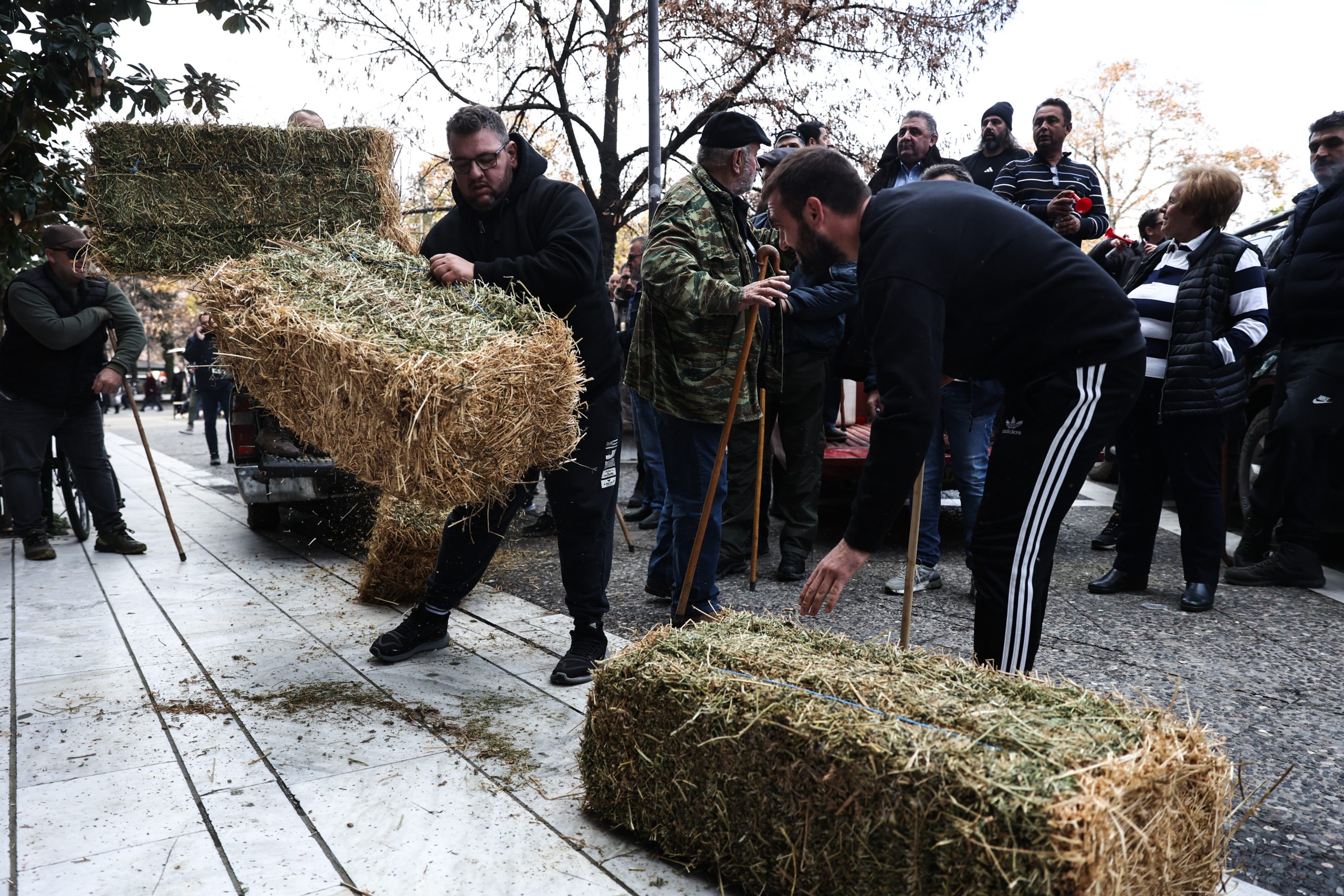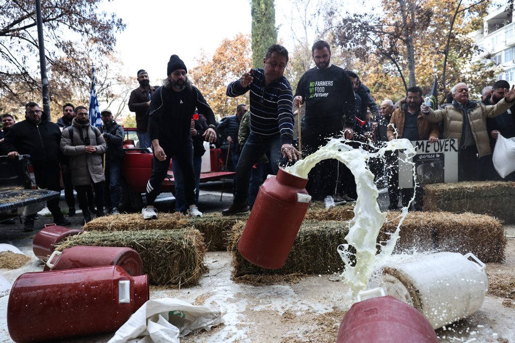 Σε μια συμβολική κίνηση, οι διαδηλωτές άδειασαν δοχεία με γάλα και πέταξαν μπάλες με άχυρο στο οδόστρωμα, καταγγέλλοντας την κυβερνητική πολιτική που, όπως υποστηρίζουν, τους οδηγεί στην οικονομική καταστροφή.
