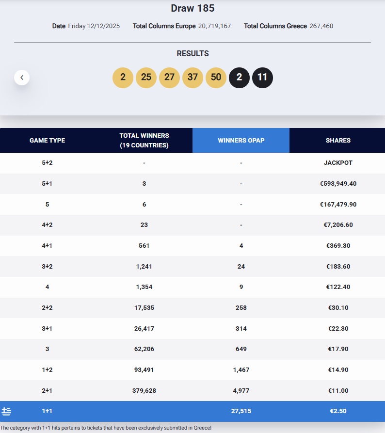Οι τυχεροί αριθμοί της κλήρωσης με αριθμό 185 είναι οι εξής: 2, 25, 27, 37, 50 και αριθμοί Eurojackpot 2 και 11.