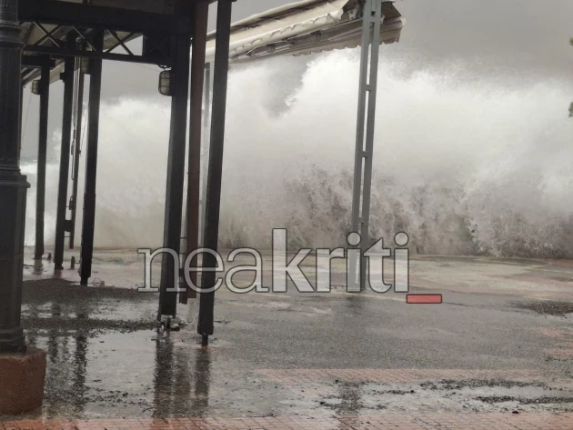 Σαρωτικό είναι το πέρσαμα της κακοκαιρίας Erminio από την Ιεράπετρα, με την παραλιακή ζώνη να δέχεται κύματα που φτάνουν μέχρι τα πρώτα σπίτια της παλιάς πόλης.