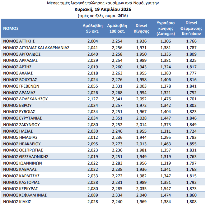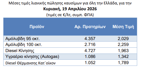 Με βάση τα επίσημα στοιχεία από το Παρατηρητήριο Τιμών Υγρών Καυσίμων για την Κυριακή 19 Απριλίου 2026, η εγχώρια αγορά καυσίμων βρίσκεται αντιμέτωπη με υψηλές τιμές, καθώς η μέση τιμή της αμόλυβδης 95 οκτανίων έχει σταθεροποιηθεί πάνω από το όριο των 2 ευρώ.